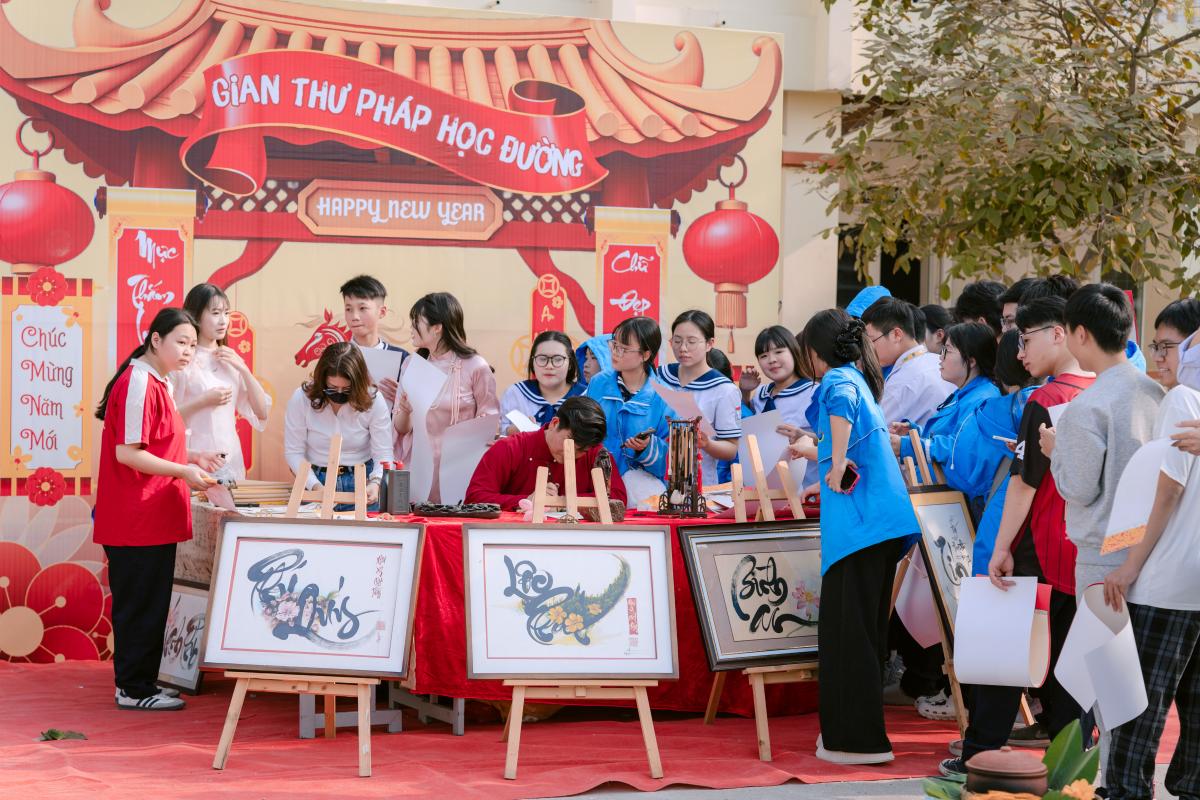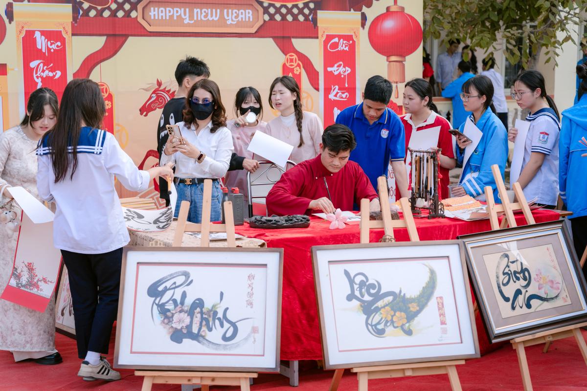 Không gian xuân thêm lắng đọng tại gian hàng thư pháp – xin chữ đầu xuân, với những nét mực gửi gắm lời chúc bình an, học tốt và trưởng thành. Đặc biệt, Nhà trường trân trọng cảm ơn thầy Nguyễn Văn Vinh – Giám đốc Công ty TNHH Giáo dục và Du lịch Thế giới Mới (New World Travel) đã đồng hành, cho chữ đầu xuân, góp phần lan tỏa giá trị văn hóa truyền thống tới thầy cô và học sinh.